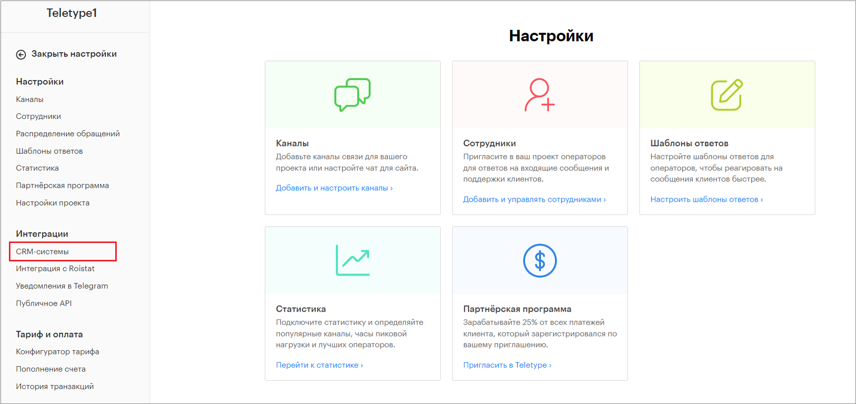 - Go to the Teletype panel settings and select the CRM systems section.