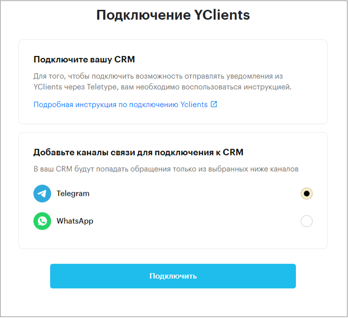 Before connecting Teletype to YClients, make sure that the WhatsApp or Telegram channel through which notifications will be sent to clients is connected to the Teletype panel and active. Then: