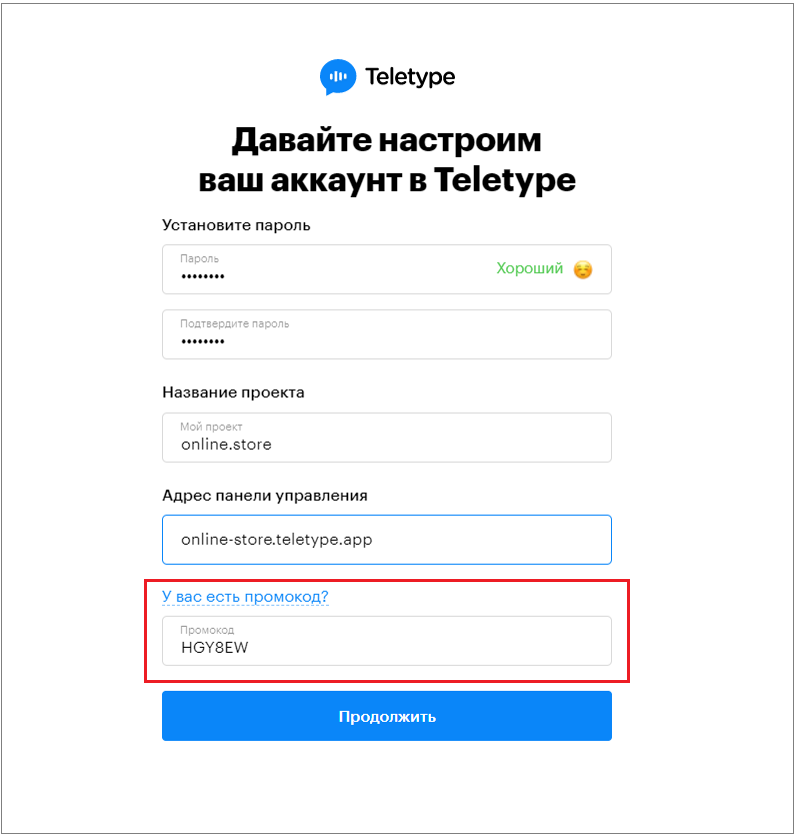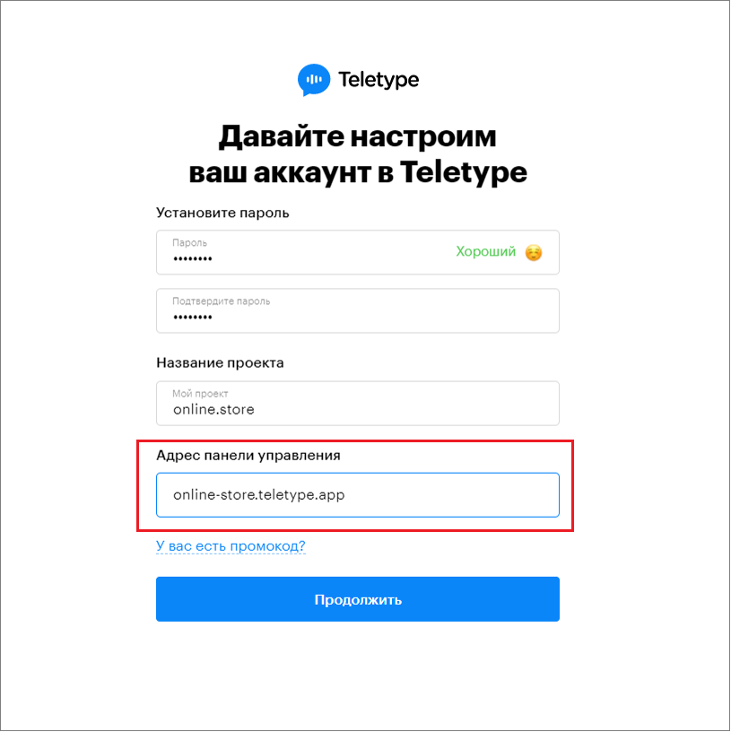 4. Change the control panel address if necessary. The control panel address is generated automatically using the formula: projectname.teletype.app.