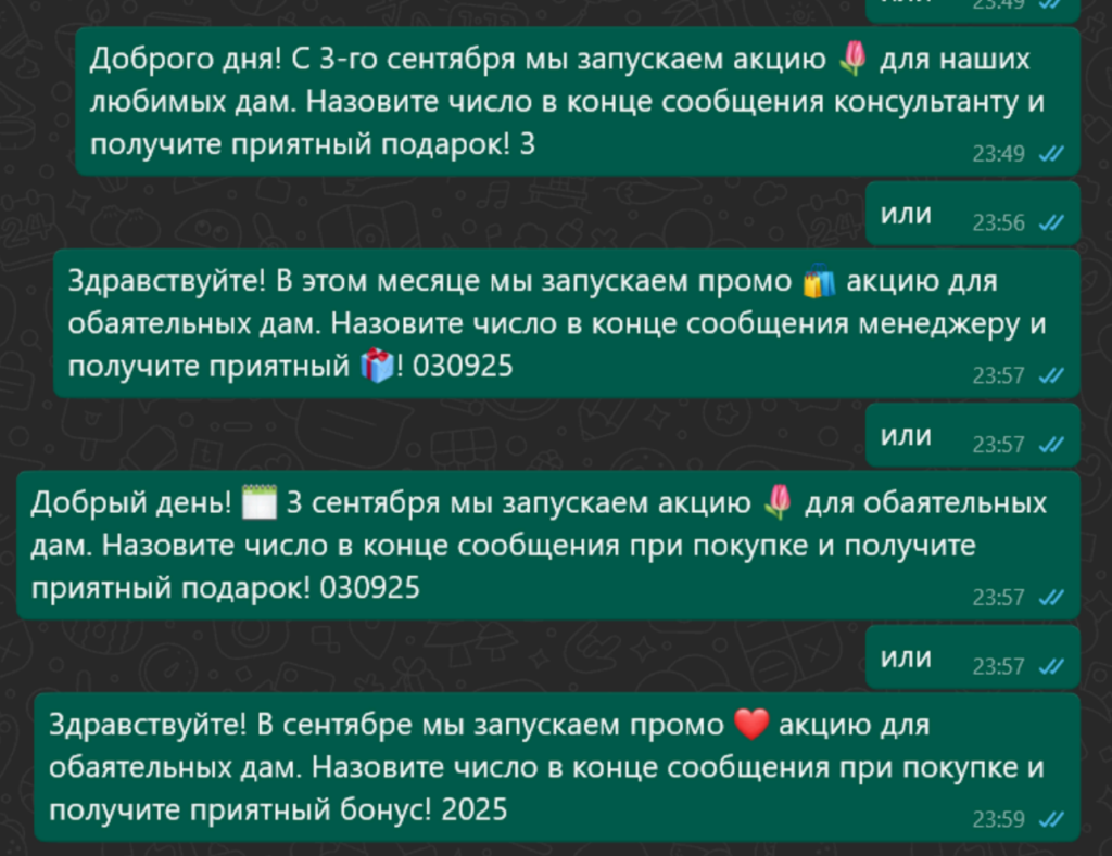 {Здравствуйте|Добрый день|Доброго дня}! {В этом месяце|В сентябре| 📅 3 сентября|C 3-го сентября} мы запускаем {акцию 🎀|специальное предложение|промо-акцию|промо ️🌹 акцию} для {прекрасных|наших любимых|обаятельных} дам. Назовите число в конце сообщения {менеджеру|нашему менеджеру|при покупке|консультанту} и получите приятный {бонус|подарок|🎁 }! {3|2025|333|030925}