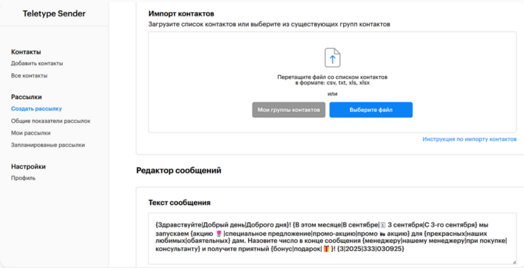 В списке контактов в формате CSV только поле «phone» обязательно для заполнения. Чтобы повысить уникальность каждого сообщения вы можете добавить другие поля, например: имя {Name}, номер заказа или абонемента {Order}, уникальные значения скидки {discount}. Эти поля можно расположить по тексту рассылки. Вы можете указать в таблице любое значение, которое необходимо — главное, чтобы оно было написано на английском языке.