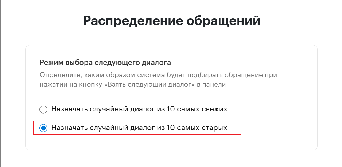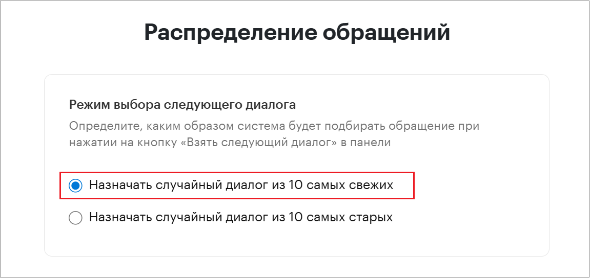 Здесь можно настроить каким образом система будет подбирать обращение при нажатии на кнопку «Взять следующий диалог» в панели.