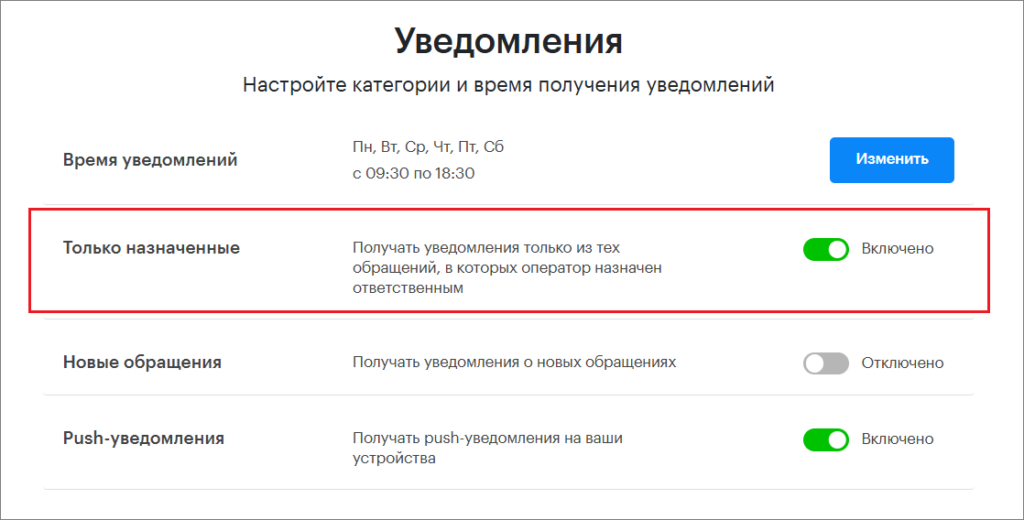 Эта настройка позволяет получать звуковые уведомления только из тех обращений, в которых оператор назначен ответственным.